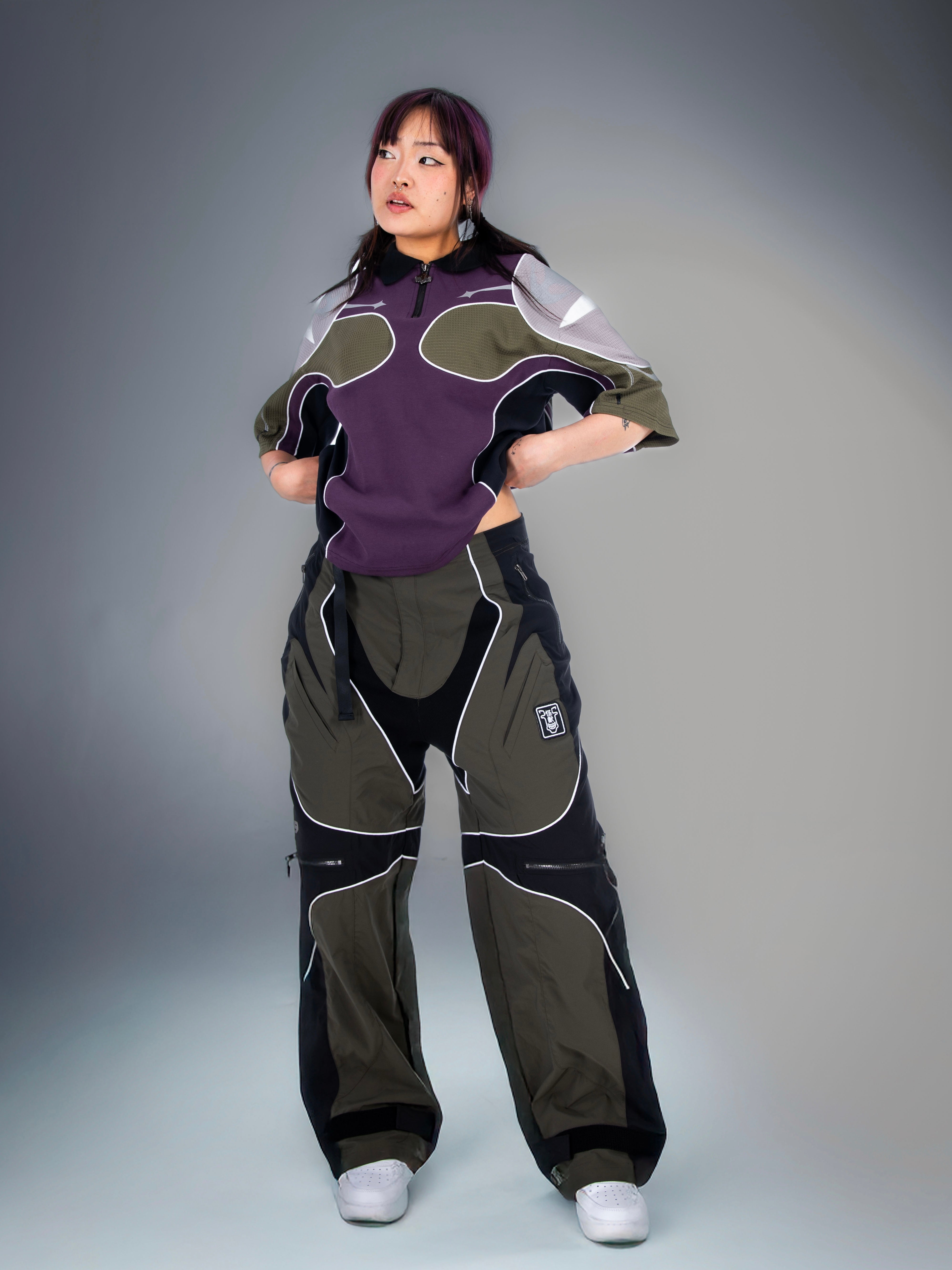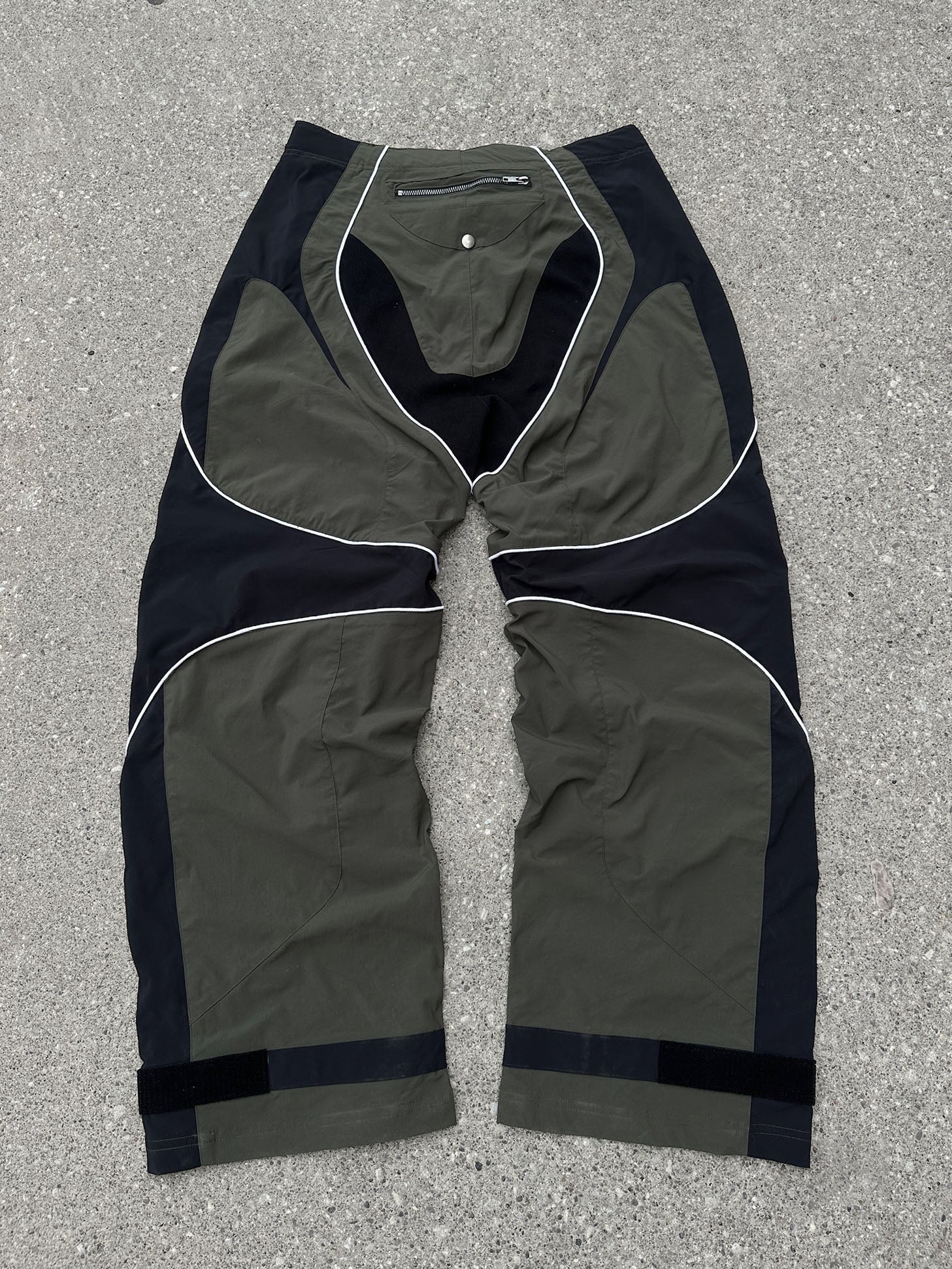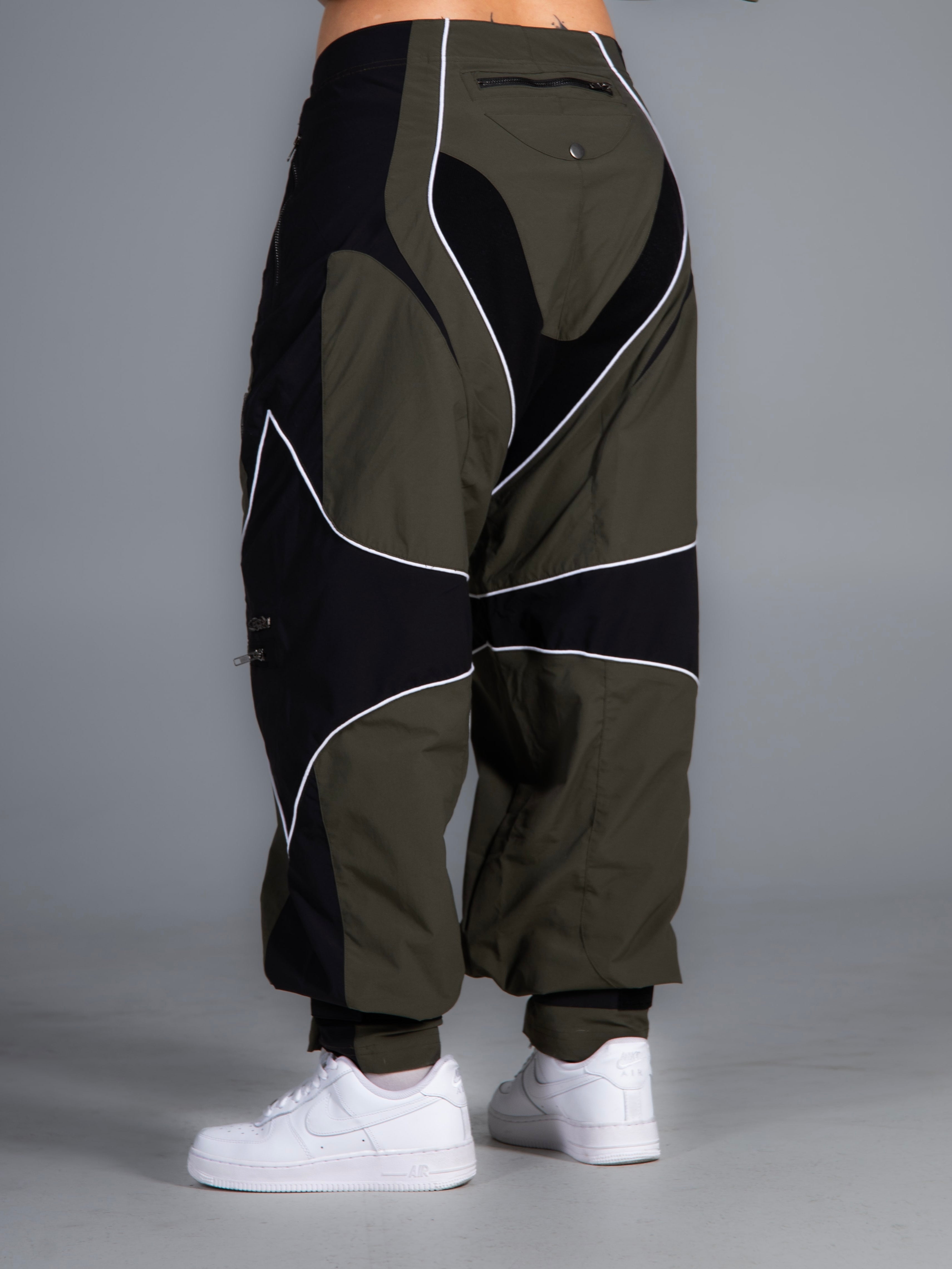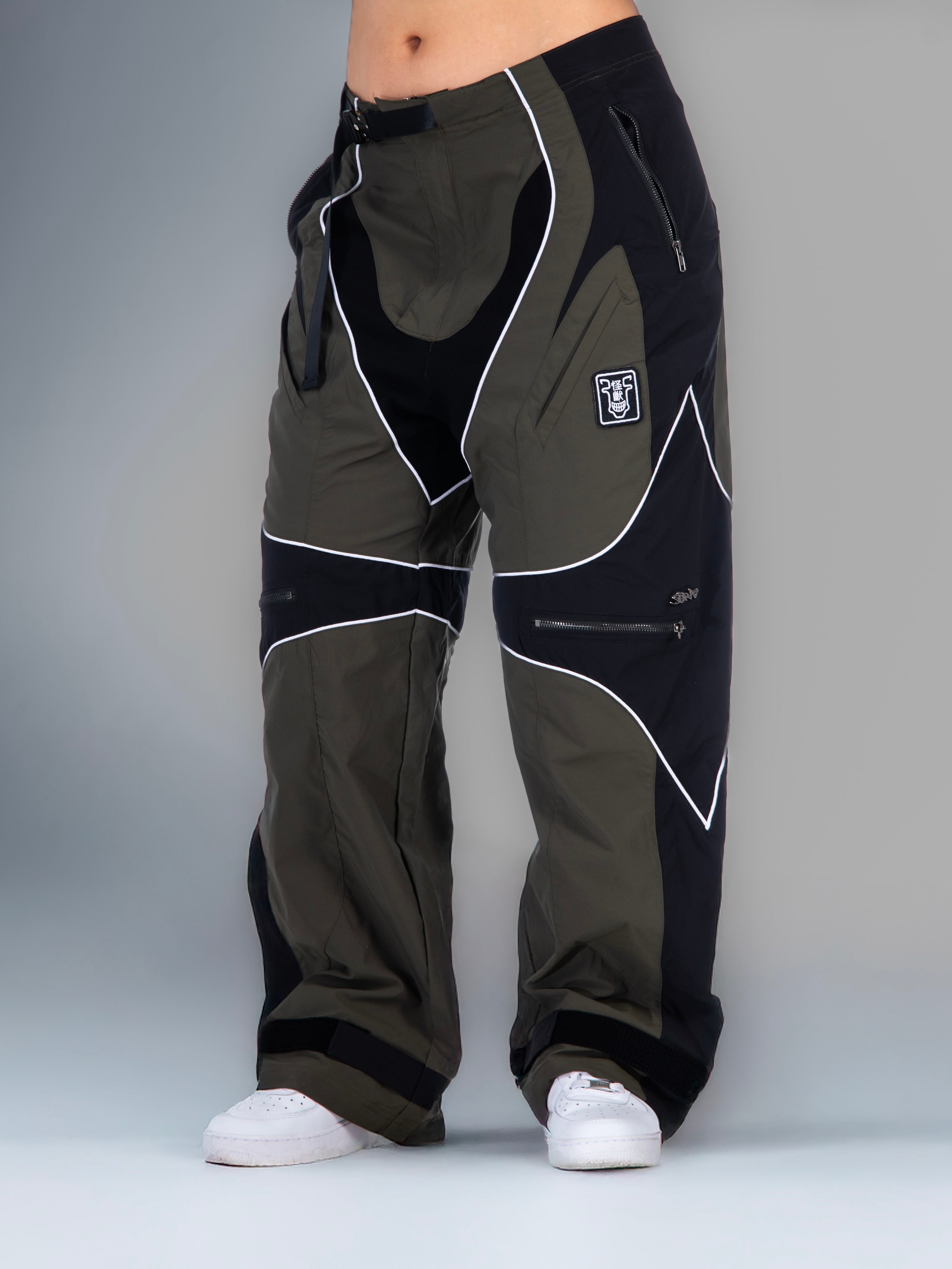 These two-tone baggy biker parachute pants have angled thigh pockets and zipped knee pockets, piping seam highlights, and a reference printed in reflective paint mixed with silver so it catches light.