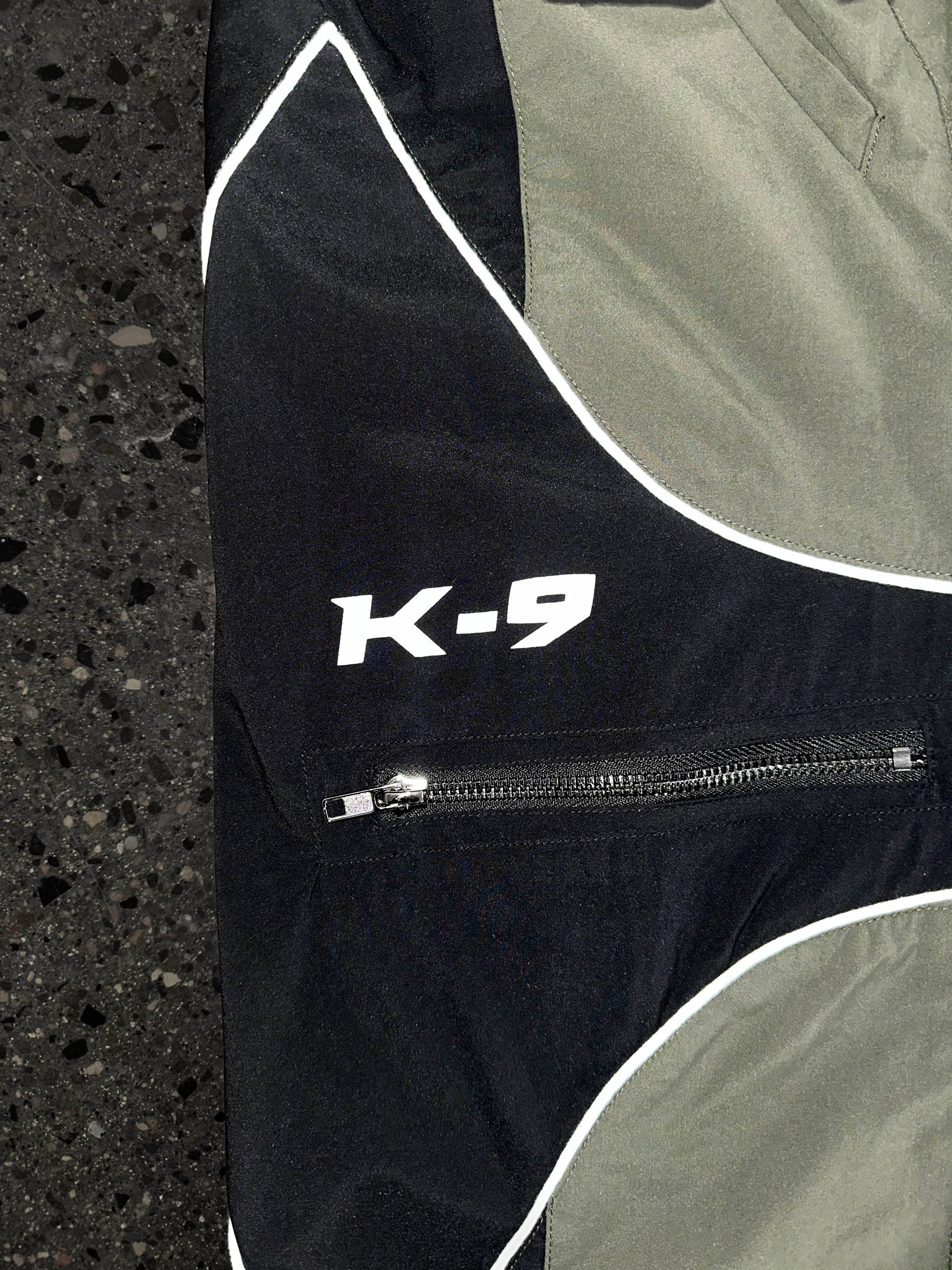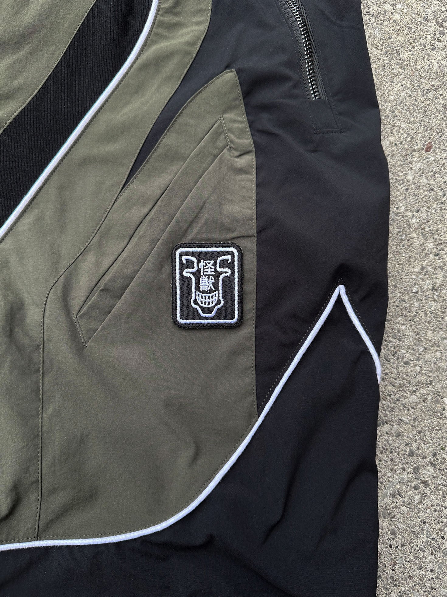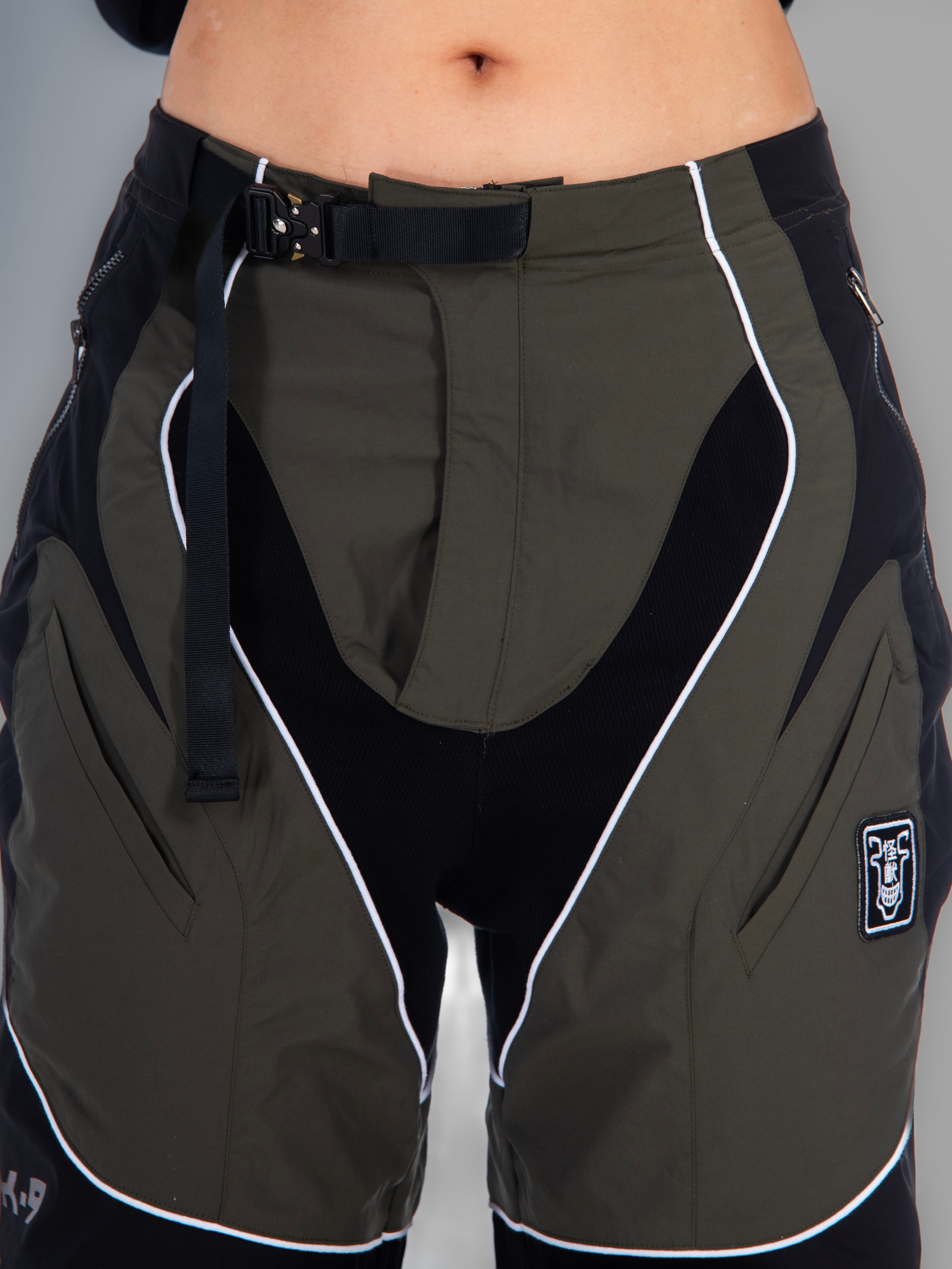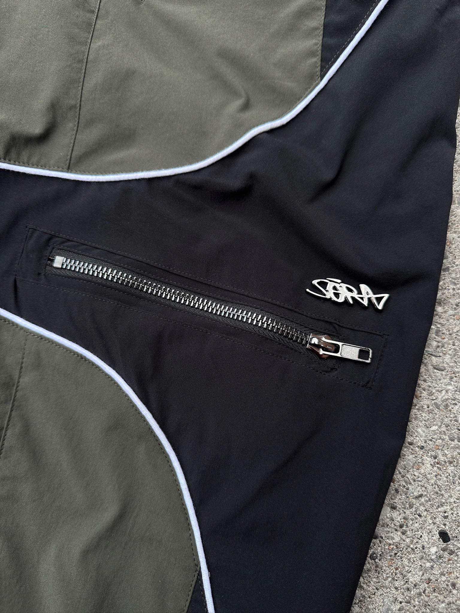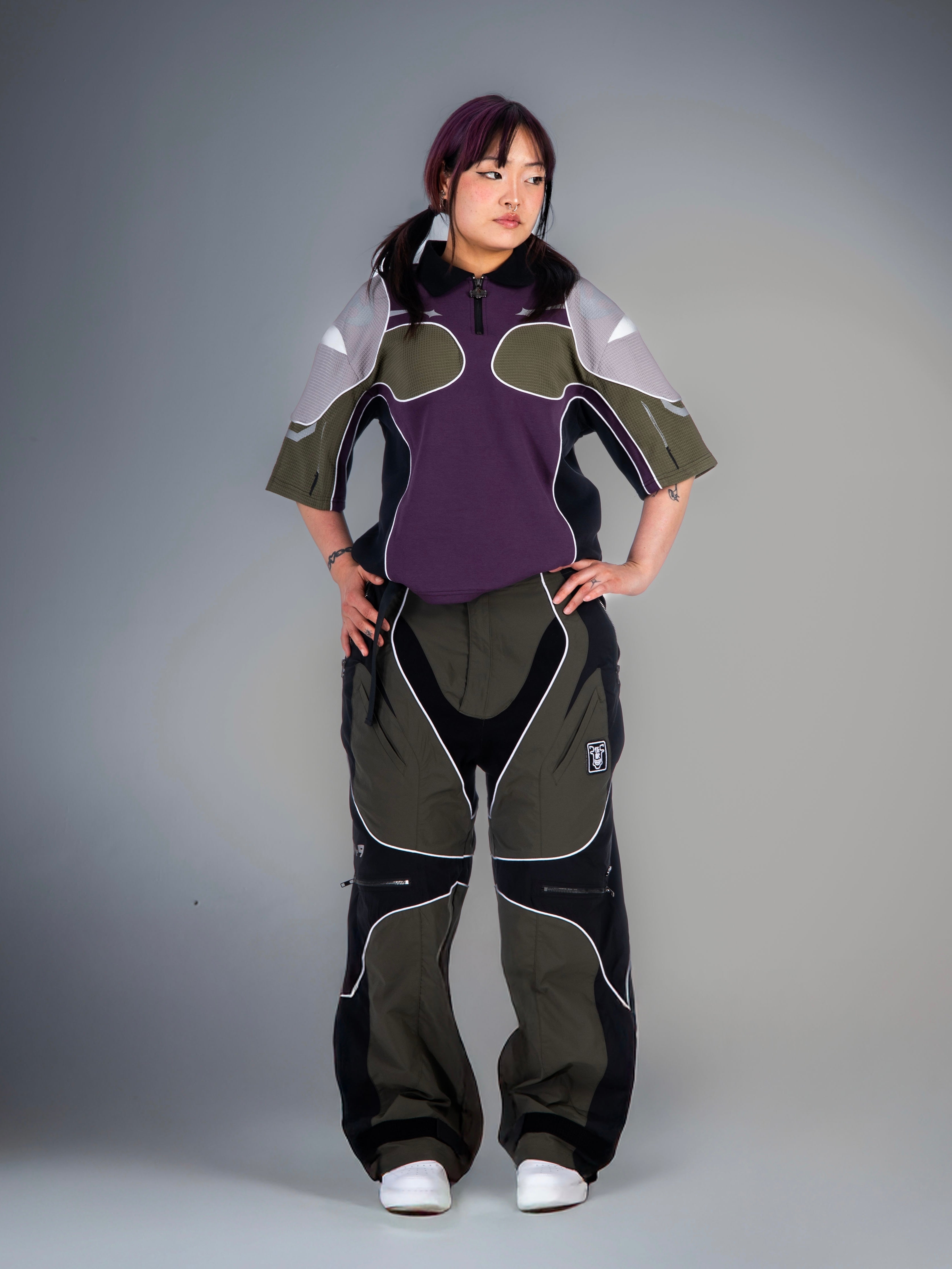 These two-tone baggy biker parachute pants have angled thigh pockets and zipped knee pockets, piping seam highlights, and a reference printed in reflective paint mixed with silver so it catches light.