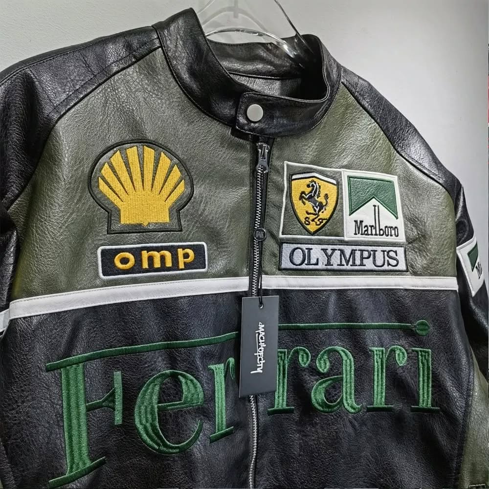 Available only on Velside, this is the ultimate racing jacket. It's made from top-quality leather with hand-stitched details, every piece is put together with serious attention to detail. It features official-style sponsor logos like Shell, Marlboro, Olympus, and the Ferrari badge. This jacket makes a statement that’s impossible to ignore.